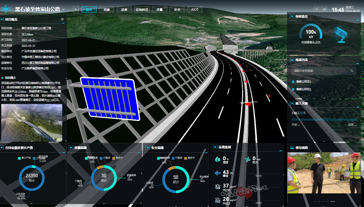 為強化風險管控,黑曾路項目部引入智慧信息化可視管理平臺,綜合運用BIM、GIS、物聯網、大數據、人工智能、無人機等先進技術,構建基于BIM+GIS+IOT+AI+PM的智慧工地平臺,實現進度、質量、安全等全方位智能化管控。